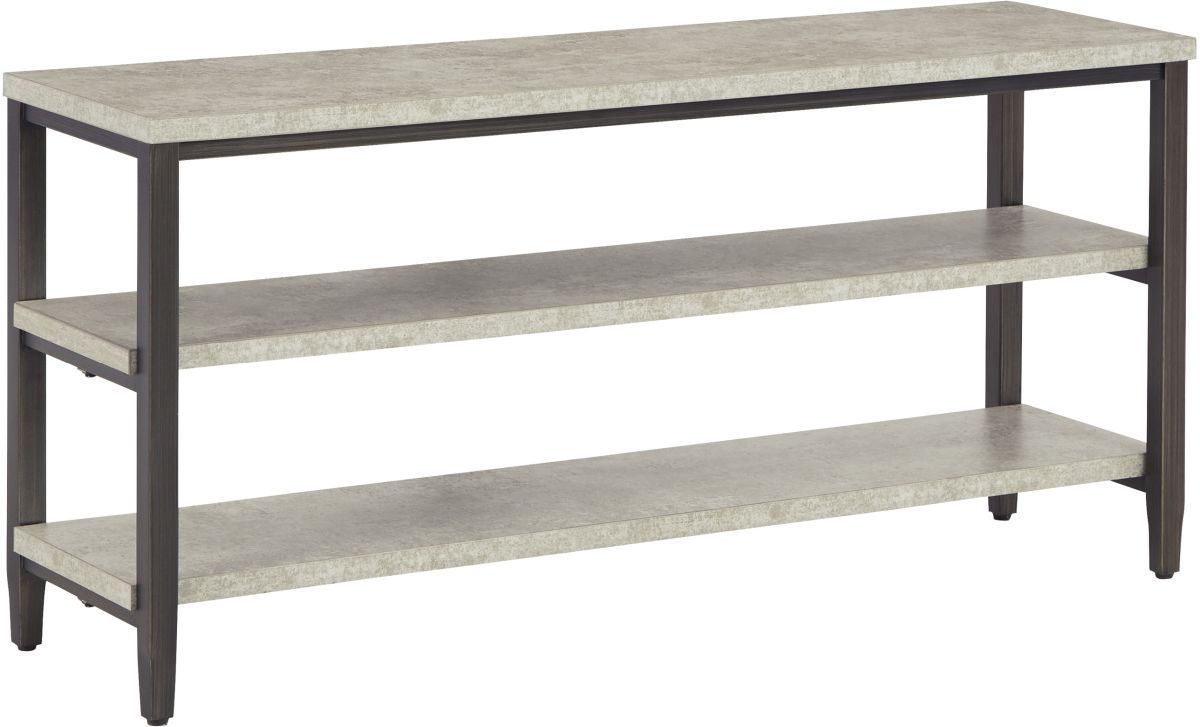 With its casual, linear style design, this spacious sofa table works wonderfully well with larger sofas and sectionals. You'll easily make use of the handy open storage that the two shelves have to offer. Features faux concrete melamine top with metal base in a dark pewter-tone finish.Read More