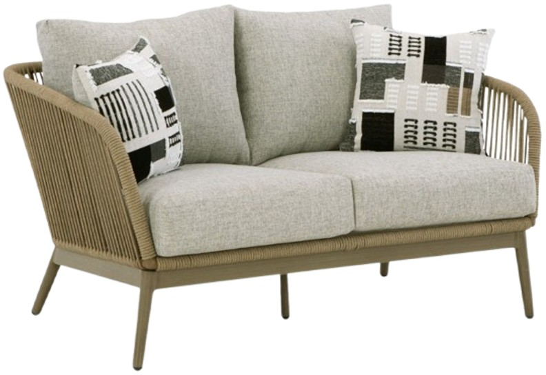 Effortless in its beauty, this outdoor loveseat echoes your easygoing sensibilities. Simply stunning in brown wood-look finish paired with handwoven rope on a sturdy aluminum frame, it’s an ideal companion for relaxing poolside or hosting friends alfresco. And with high-performance beige Nuvella+™ fabric, this loveseat makes stylish living a breeze.Read More