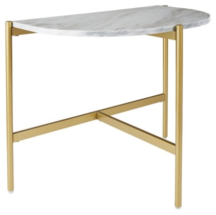 Add a bright spot to your contemporary space with this side table. The replicated Carrara marble shelf provides a chic sophistication while a goldtone finish on the metal frame heightens the modern aesthetic.