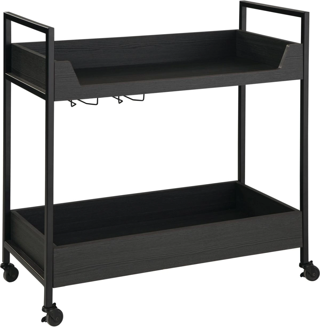 Impress your party guests in style with this bar cart. A blackened effect finish keeps the two tray shelves looking sleek, while a stemware rack holds wine glasses with ease. Smooth-gliding casters offer easy mobility, and a sturdy design with metal rails provides convenient storage of bottles and utensils.Read More